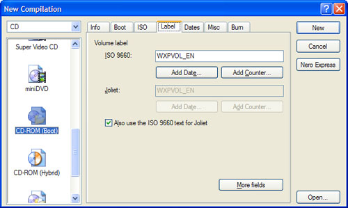 Now, select the Label page in Nero Burning ROM. Under "Volume label, ISO 9660" enter the name of your CD (WXPVOL_EN in my case).