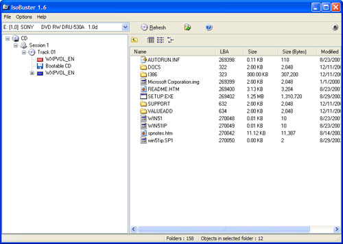 Launch ISOBuster, assuming you still have your XP CD-ROM in your drive it will look like this:
